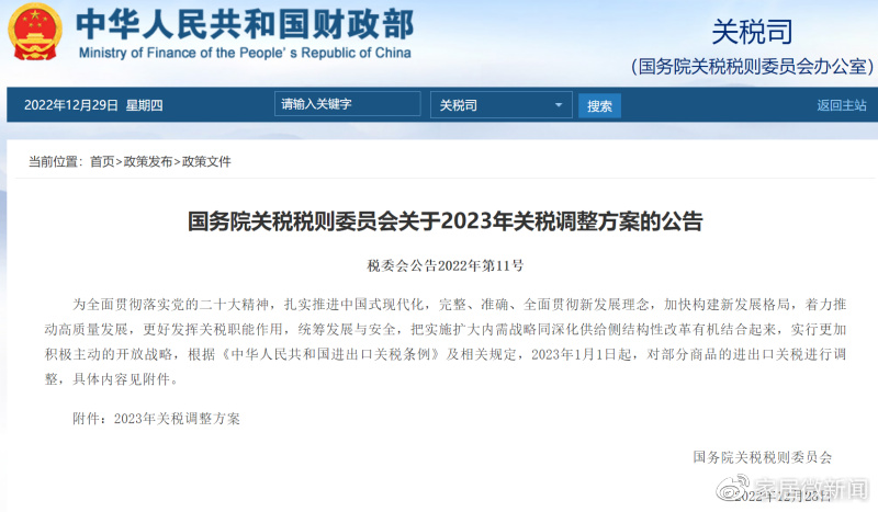 12月29日,国务院关税税则委员会发布公告称,为增强国内国际两个市场两种资源联动效应,2023年1月1日起,我国将对1020项商品实施低于最惠国税率的进口暂定税率。