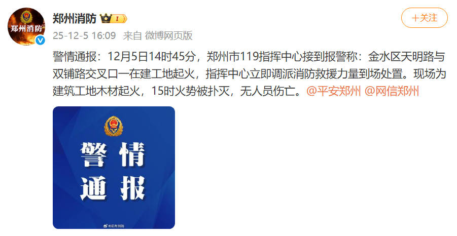警情通报:12月5日14时45分,郑州市119指挥中心接到报警称:金水区天明路与双铺路交叉口一在建工地起火,指挥中心立即调派消防救援力量到场处置。现场为建筑工地木材起火,15时火势被扑灭,无人员伤亡。