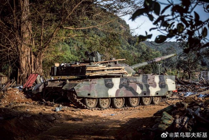 #泰柬冲突# VT-4型主战坦克,炮塔周边捆上了木材作为附加装甲。还有一段画面显示,VT-4坦克的一部分正面反应装甲被激活了,保护了炮塔的安全。